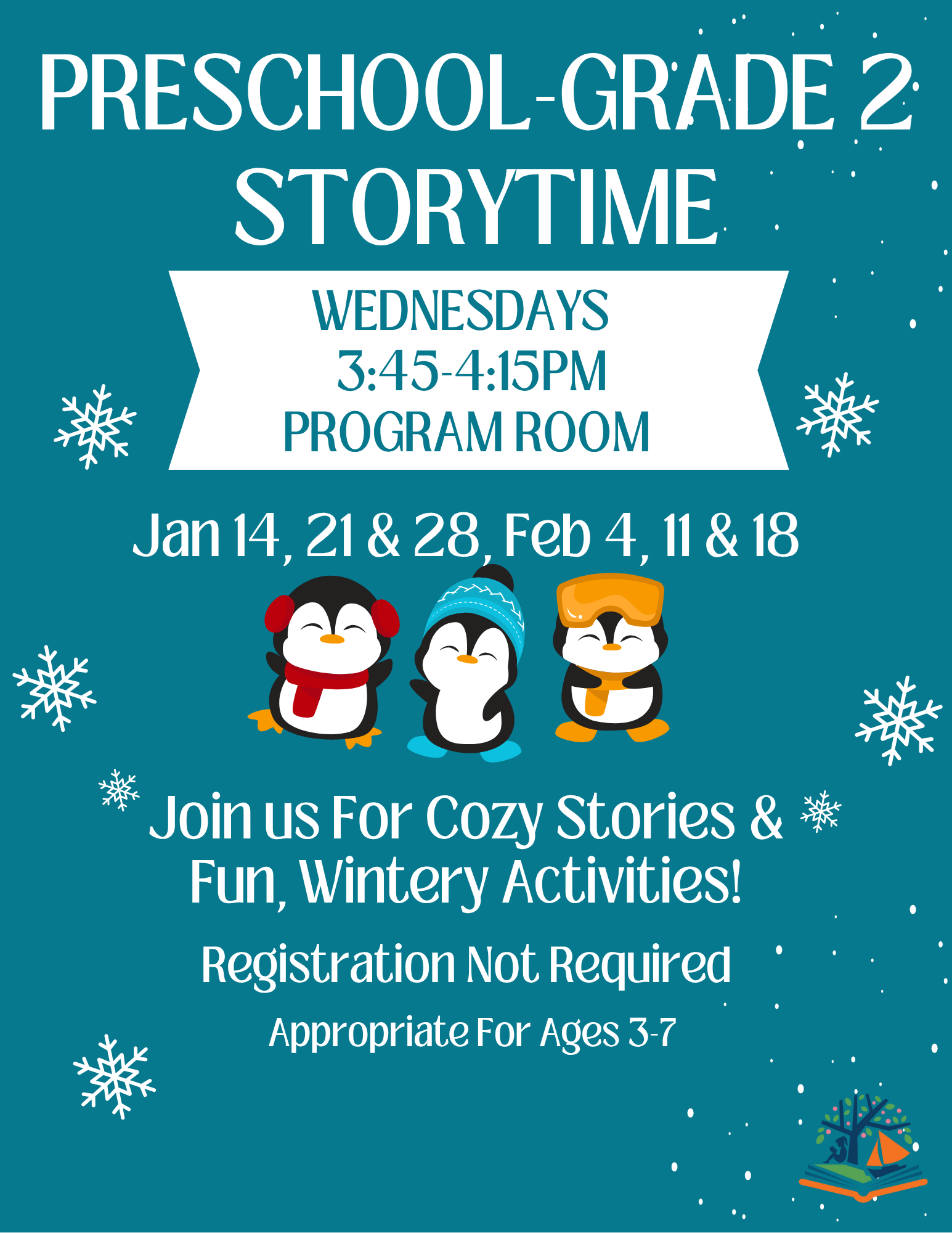 February 4, 2026 @ 3:45 pm - 4:15 pm Storytime (Preschool – 2nd Grade) Storytime (Preschool – 2nd Grade)