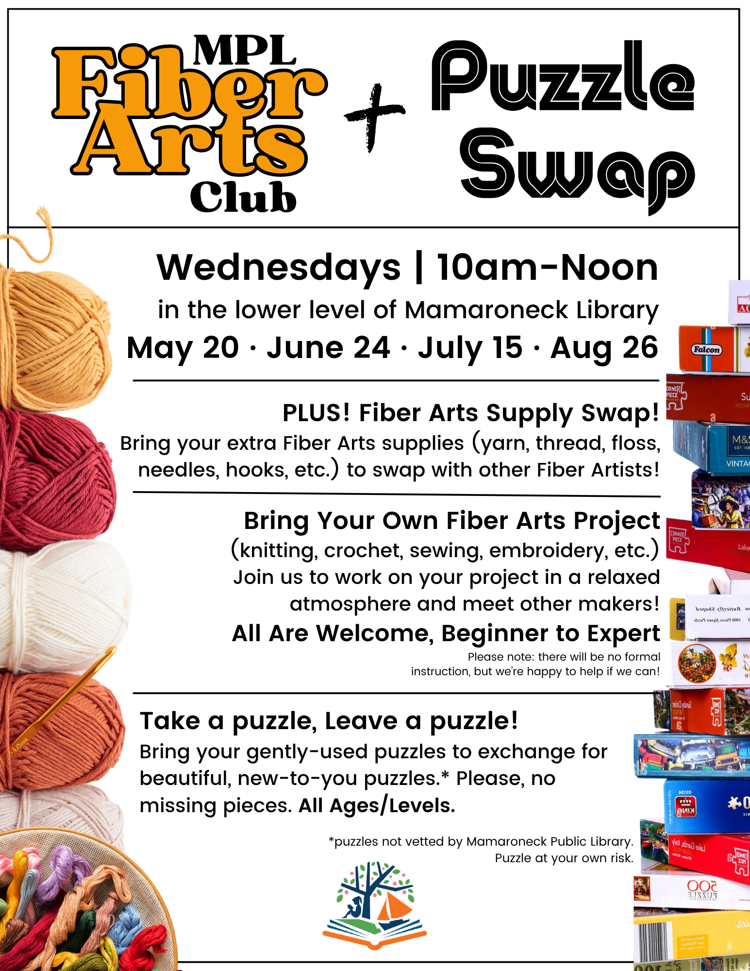 August 26 @ 10:00 am - 12:00 pm Fiber Arts Club + Puzzle Swap Fiber Arts Club + Puzzle Swap Adult No Registration - just stop by!